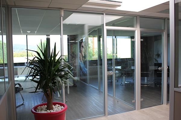 posés en applique. On peut également installer des verres sablés ou poser des films décoratifs. La cloison de bureau vitrée est montée dans